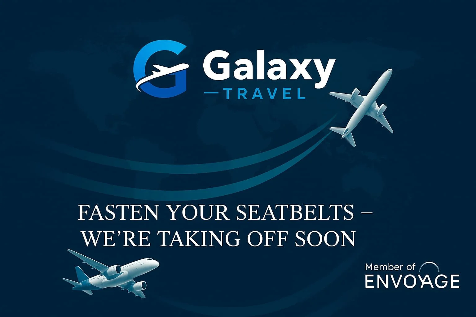 Galaxy Travel promotional image with an airplane and text that says, 'Fasten your seatbelts – We're taking off soon.'